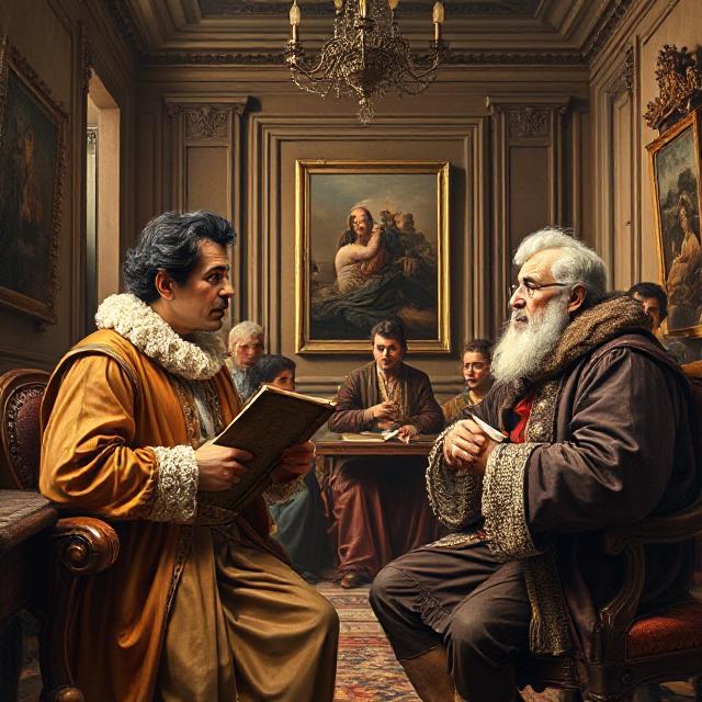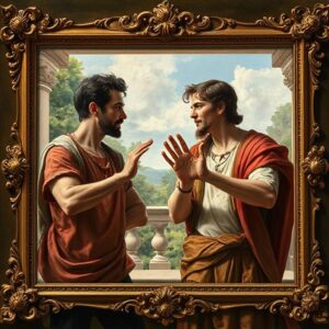 “A realistic scene of a person bragging about their achievements to a friend, the friend reacting with a humorous expression, casual indoor setting, natural lighting, warm colors, educational illustration of English conversation.”