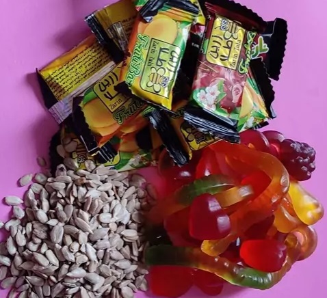 معادل انگلیسی تنقلات رایج ایرانی (پشمک,پفک,لواشک,پاستیل,تخمه,چیپس)