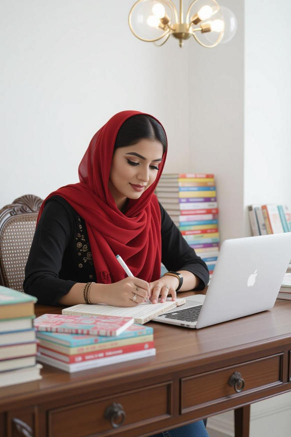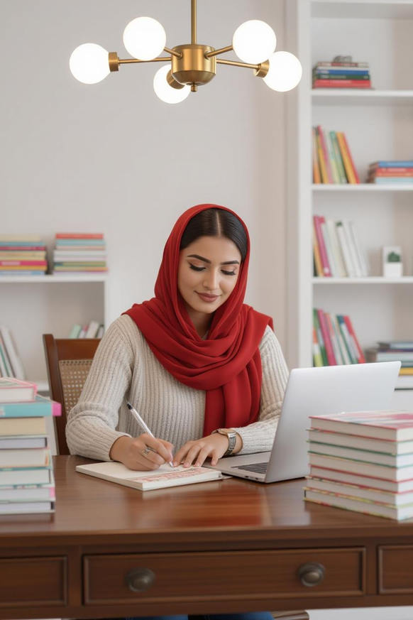 - She is reading a book. 📖